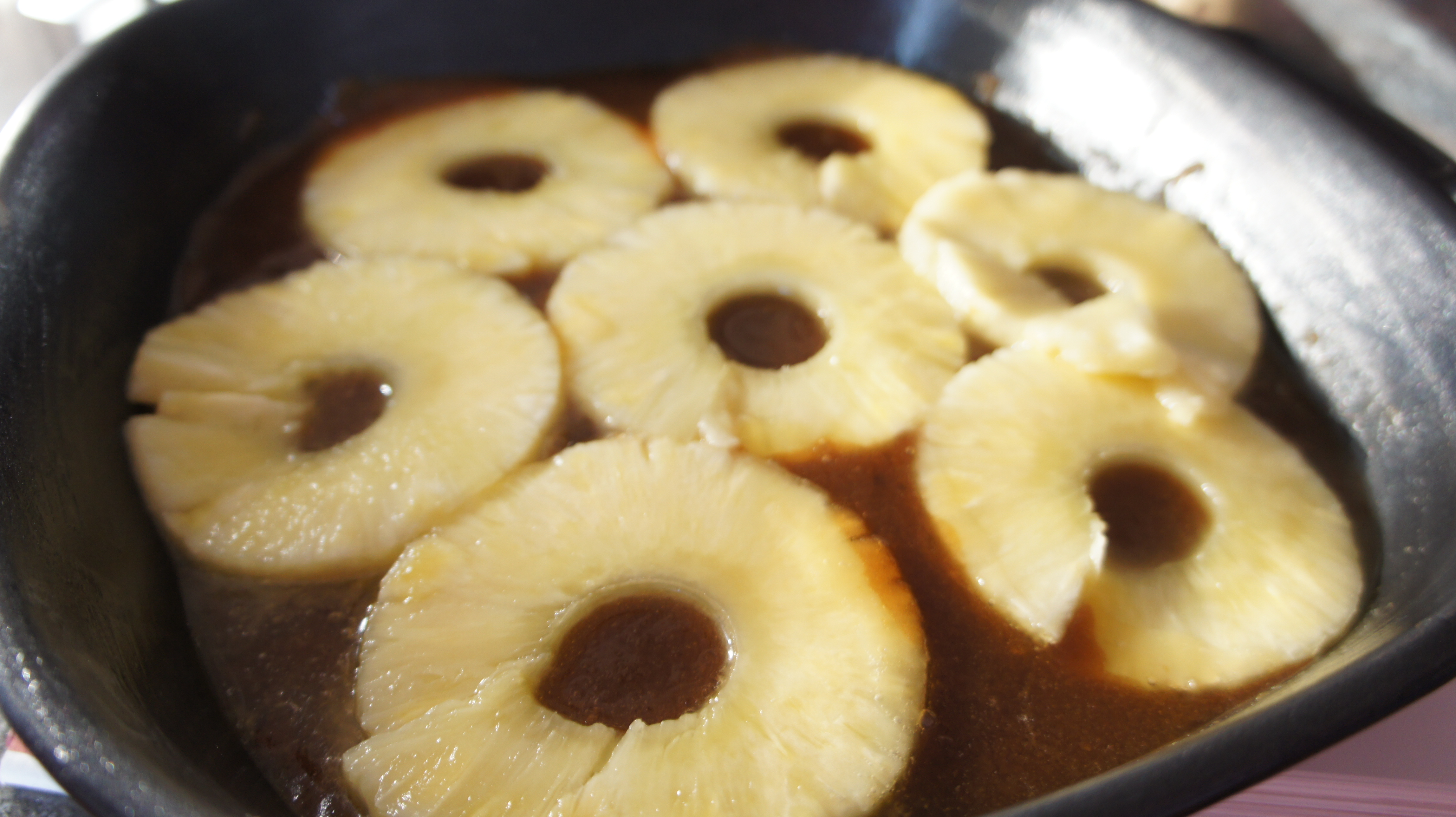 In a small saucepan over medium heat, melt the butter. Add the brown sugar and stir until small bubbles appear, 2-3 minutes. Remove the mixture from the heat and pour into the prepared pan. Arrange your pineapple half-moons/circles in the pan so that you fit in as much as possible, but do not overlap the fruit. Set aside