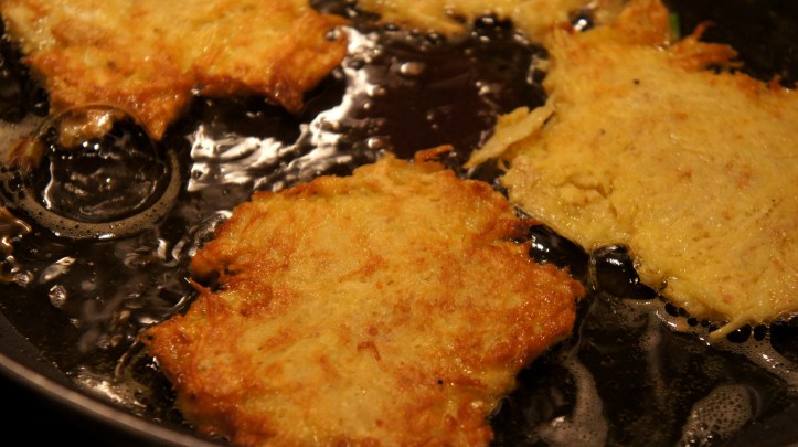 Never having made latkes on my own before, I chose a pretty simple recipe. We happened to have parsnips in our fridge, so this variation was a pleasant surprise. Another great thing about this recipe? You can make it healthier! Simply sub in whole wheat flour instead of white flour and there you go! You won’t taste the difference, but you’ll have heart smart latkes.