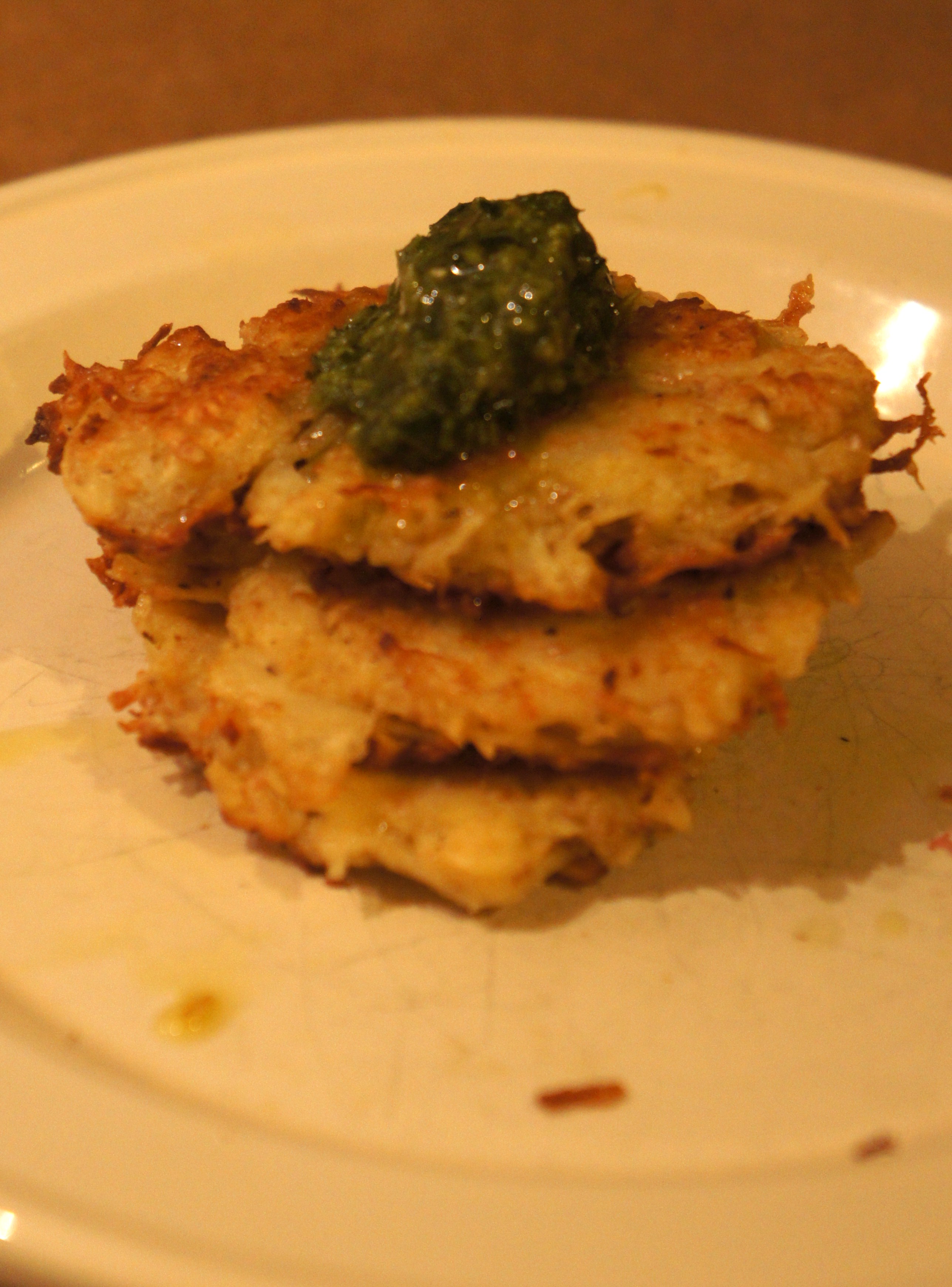 Traditionally, latkes would be served with sour cream or apple sauce. I had neither on hand…so I improvised! Pesto was a delicious accompaniment.
