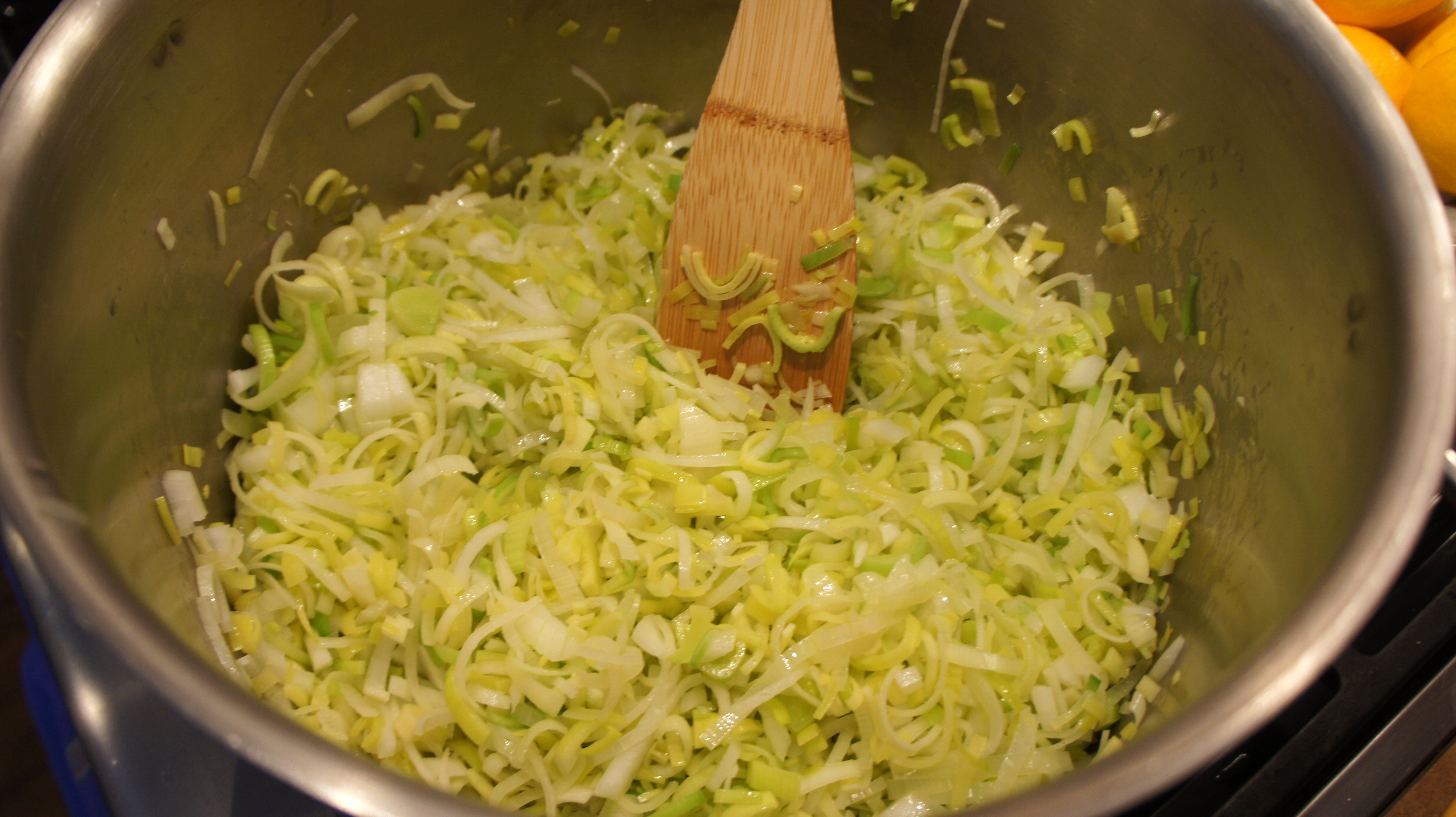 - Sweat the vegetables. Place a wide sauce pan over medium-low heat and add the olive oil (or butter). When the oil is hot (or the butter has melted) add the leeks and the onion. Stir and make sure they are covered in the oil. Cover and cook until tender, approx. 15 minutes. Check every couple of minutes and stir the pot; when you’re sweating the vegetables you don’t want anything to brown at all, just become tender.