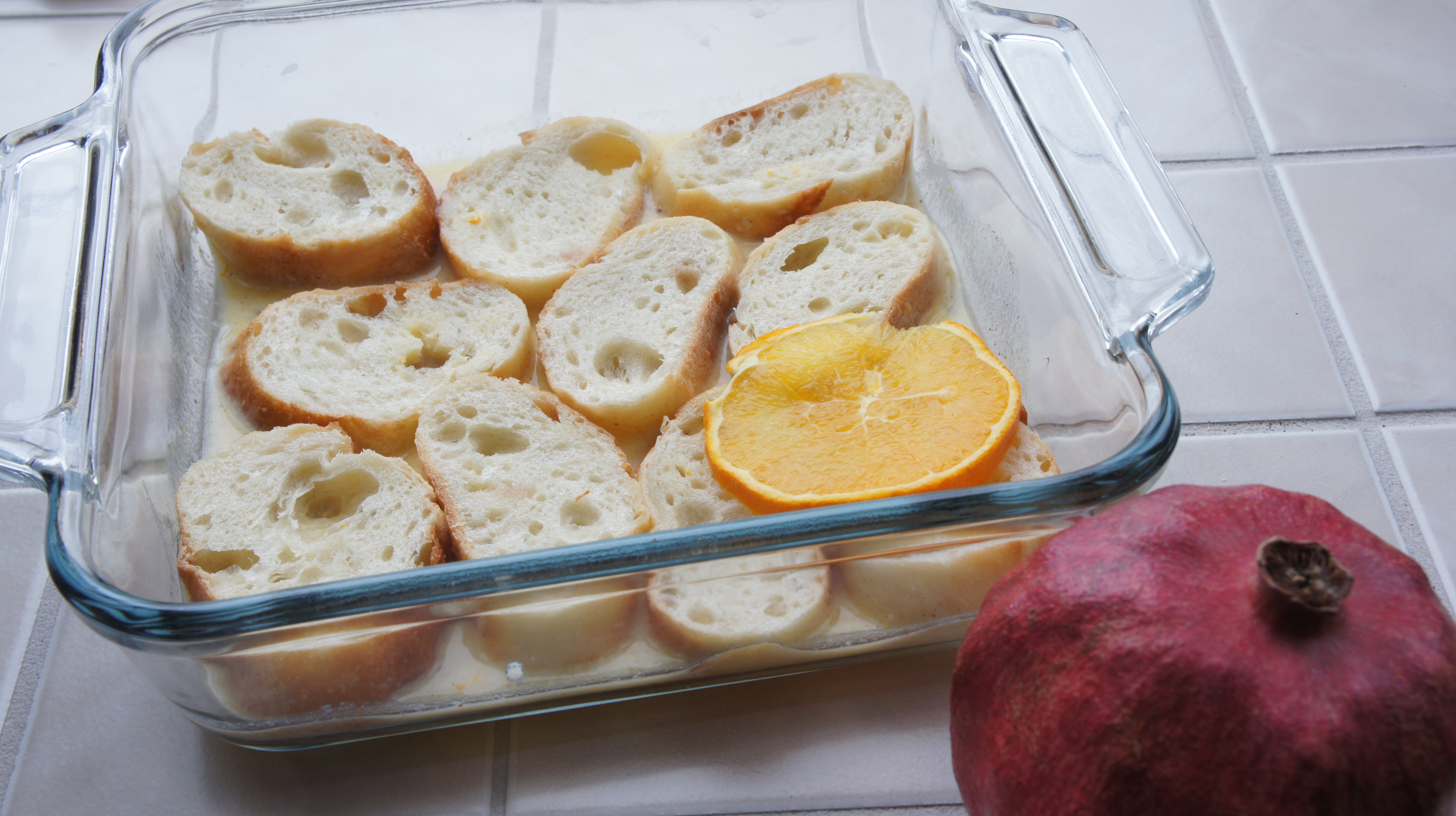 Soaking the baguette in the egg mixture (with fresh orange and pomegranate juice)