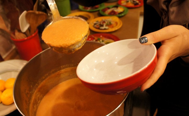 The easy-to-follow recipe for the red-lentil soup is from Gourmet Magazine: http://www.epicurious.com/recipes/food/views/Red-Lentil-Soup-with-Spiced-Oil-11495. I wouldn’t skip out on the spiced oil since it’s a snap to make and adds a nice kick to the soup. It would fit well in any kind of Indian-inspired menu; the soup is slightly reminiscent of dahl and is really tasty over rice or grains.