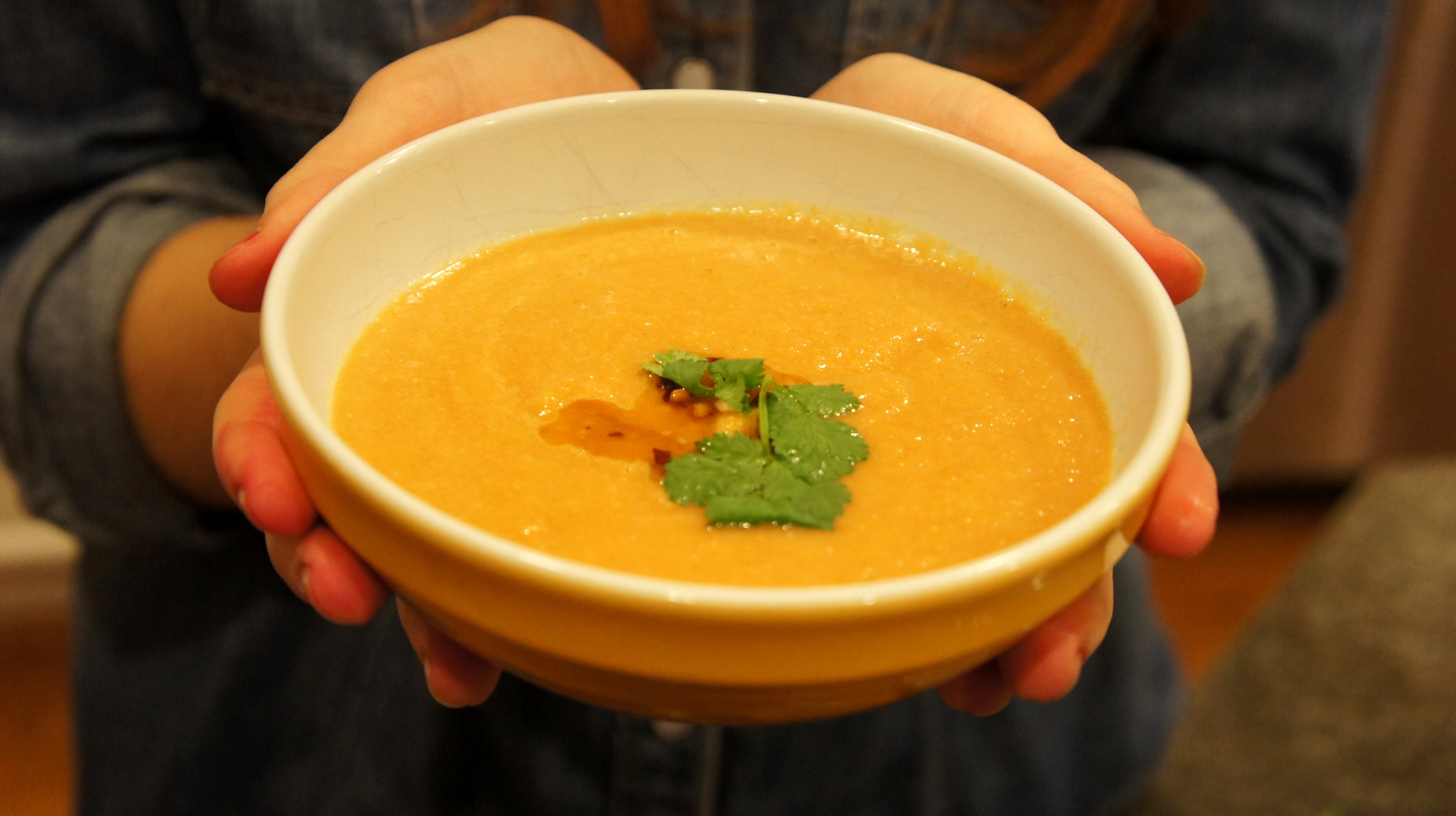 This red lentil soup is very simple to prepare, but with a drizzle of the spiced oil on top and garnished with a sprig of coriander, it will look like you slaved over the stove.
