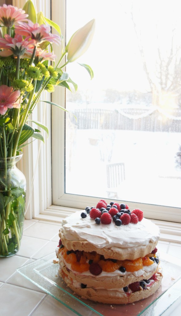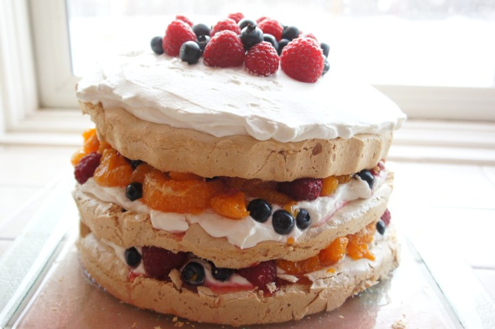 I first tried this dessert in the summertime when strawberries were abundant and we had raspberries growing in our backyard, but it’s easy to feature whatever fruit (or sliced nuts!) you like best and whatever is in season. I used berries and mandarin oranges…delish. The recipe calls for sour cream in the whipped cream to thicken it, but I strained some plain non-fat yogurt instead — worked the same way, but a little healthier! Other than that, I followed the recipe exactly, it’s great. The brown sugar in the meringue really adds some more depth to the light dessert. Enjoy!!