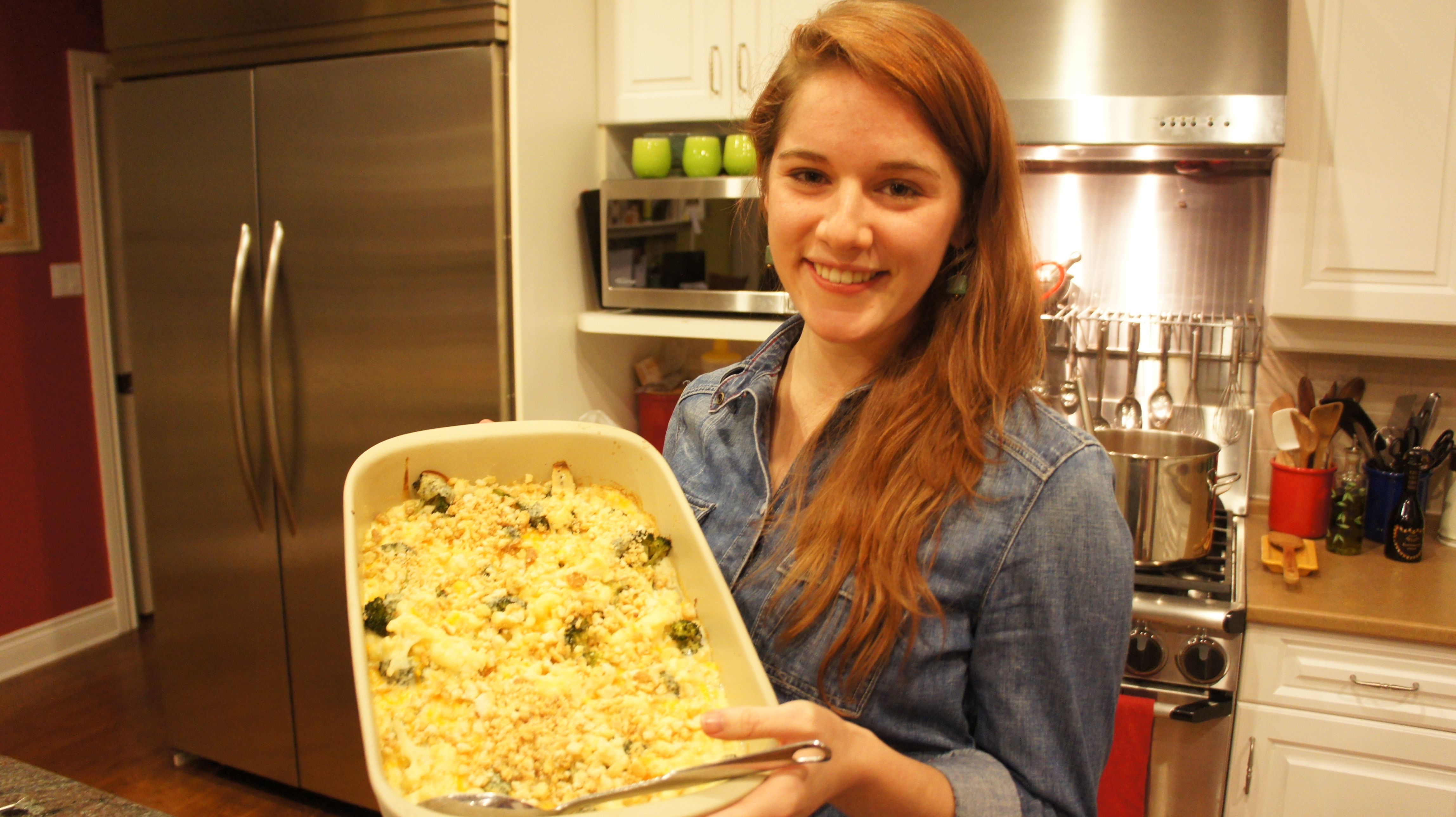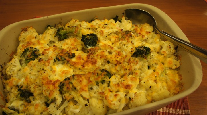 Cook the cauliflower and broccoli together until just barely tender (they will get softer in the oven). Placed the cooked veggies in the bottom of the casserole dish.