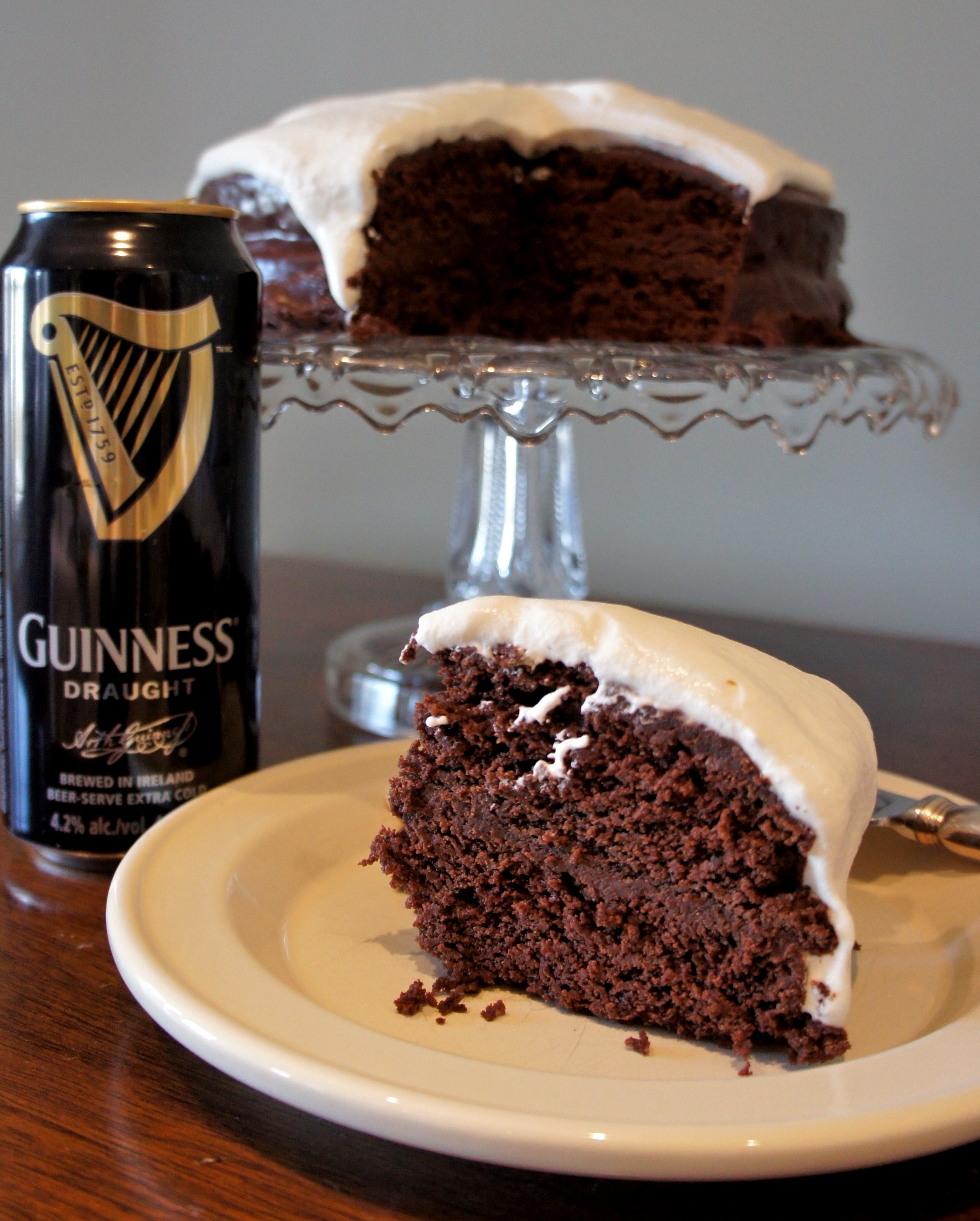 In honour of Saint Patrick’s day I jumped at the chance to throw Guinness in a recipe to make it un-authentically “Irish”. This Saturday I might just be hopping on the bandwagon of people who claim to have more Irish ancestry then is true (I do have some though, really!), enjoying dyed green beer and sporting a shamrock, but this dessert is actually a classy (and delicious) way to celebrate the day on which everyone is Irish-ish. And really, chocolate cake + beer…I knew good things were going to come out of the oven.