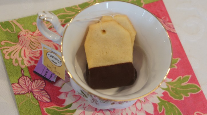 I cut out the tea-bag shapes free hand, and made a little hole at the top of each one with a sterilized nail. Once they were baked I tied on their little tea labels and dipped the bottom of each one in melted chocolate — these are perfect for dunking in your tea. If you want to save these for your next tea party (or late night study session…) just layer them in a container with parchment paper between each layer, and you can freeze them for a couple of months.