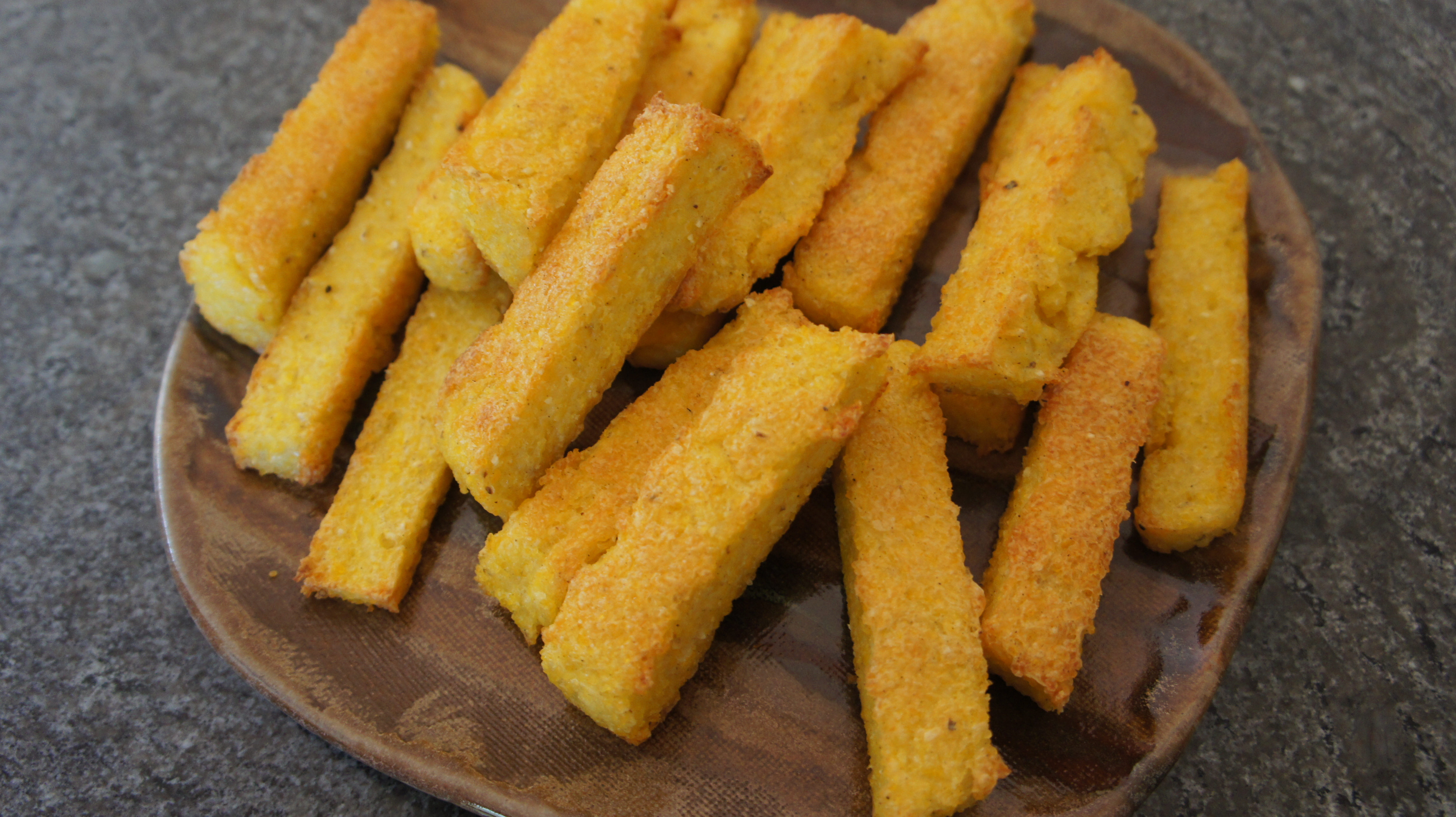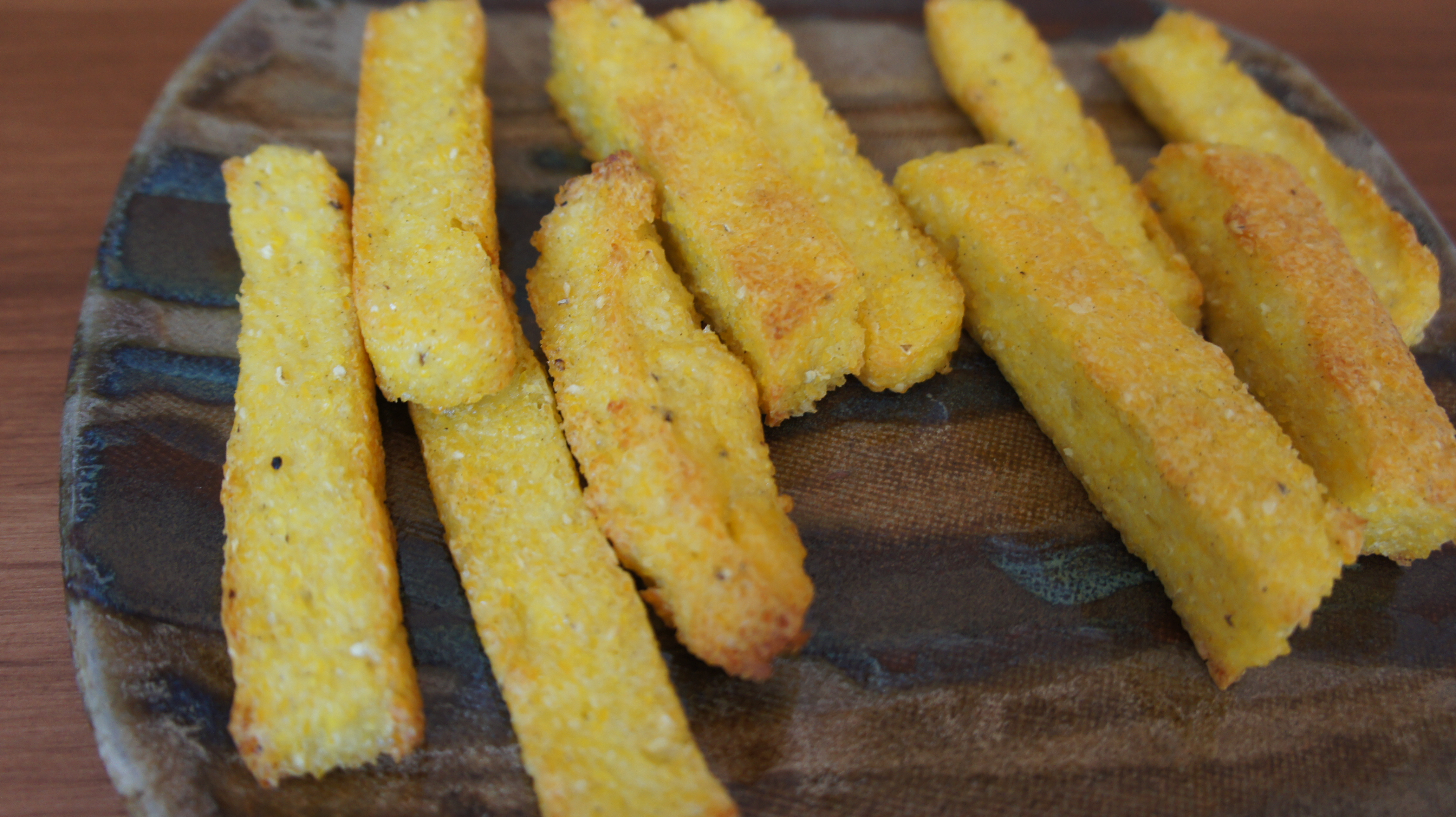 Bring cornmeal, salt, and water to a slow simmer in a thick-bottomed pot, stirring often for about 20 minutes. The polenta will become thick. Stir in cheese, herbs, and olive oil. Spread polenta out in a large, shallow pan (or a couple) to approx. 3/4 inch depth. Cool in the fridge for 1 or 2 hours. Slice into the shape of your fries. Line a baking sheet with parchment paper and bake your fries at 425 F for about 45 minutes, flipping them over halfway through, or until the look golden and crispy on the outside.