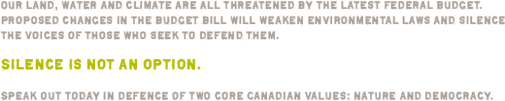 As I mentioned, the event I went to was non-partisan (there were representatives from all the major Canadian political parties except for the Conservatives, but that’s not really surprising…), and it was very encouraging to see people from different political backgrounds come together to fight for our environment. I honestly believe that even Conservative supporters can’t be huge fans of this bill — we all share this planet and its future will affect all of us. Regardless of party values, we need to work together for the environment; an environmental coalition. So please, if you want to get involved, write letters to your MP, to newspapers, to the prime minister’s office, call talk shows, make your voice heard!