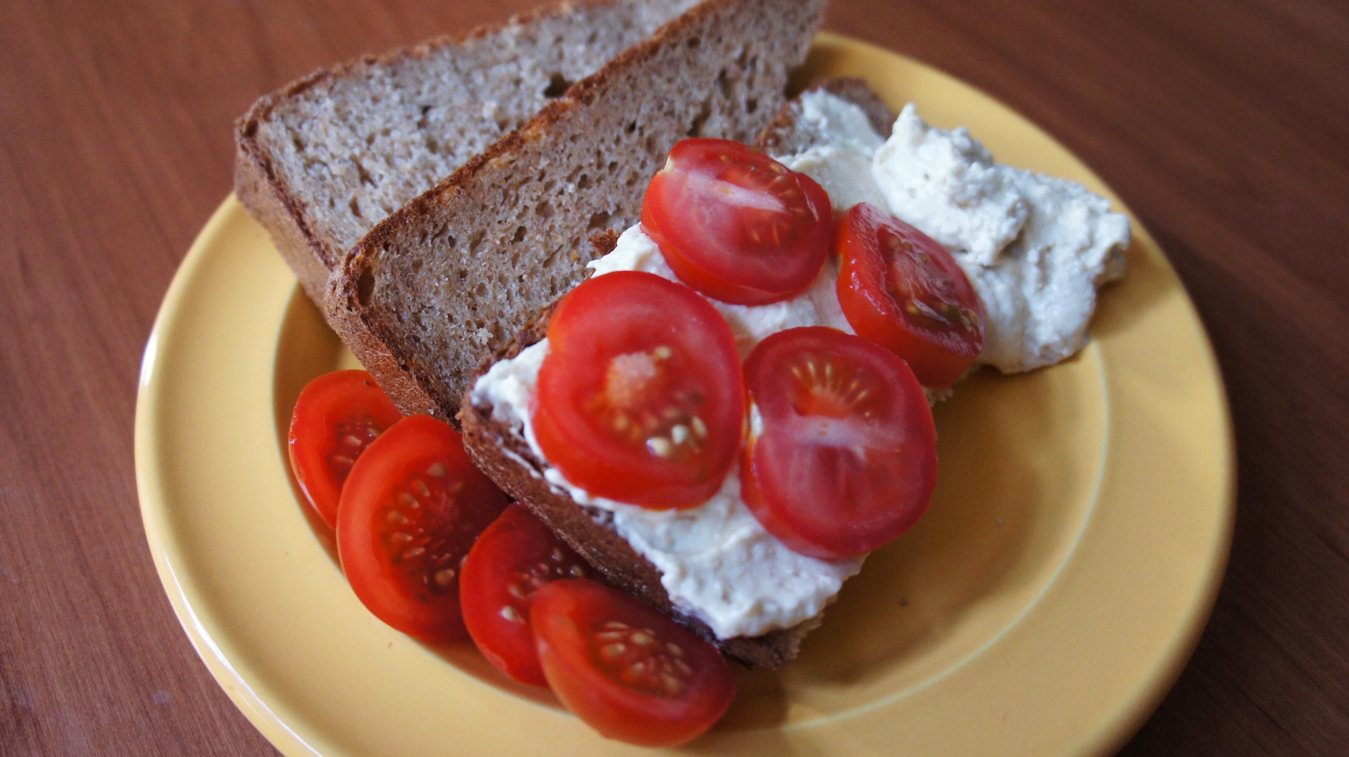 A typical lunch for my Dad combines his bread with hummus and sliced tomatoes; no fuss, and of course, it’s fresh and healthy goodness. So, I told my Dad I wanted to make his bread for the blog, and he was very enthusiastic (he even came up with calling it “Dr. Tom’s Oatmeal Bread”).  We made it together and when I took it out of the bread machine I was pretty disappointed to see that the loaf and risen too high and collapsed in on itself.   Ever the supportive father, Dad assured me that since you can really play around with the quantities of each ingredient without it making a huge difference it would still taste great, it just looked bad. Excellent. Oh well, he was right! It was still delicious.  I guess he just has the magic touch for his bread…I’ll have to keep practicing.  Thanks, Dad!