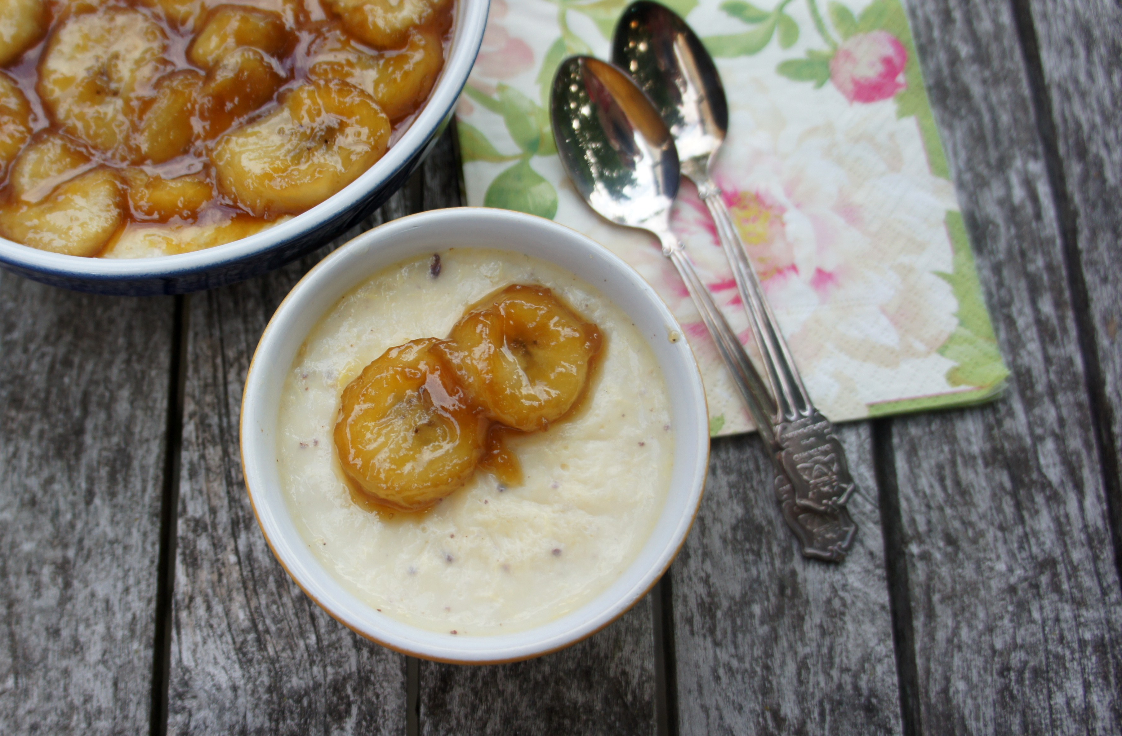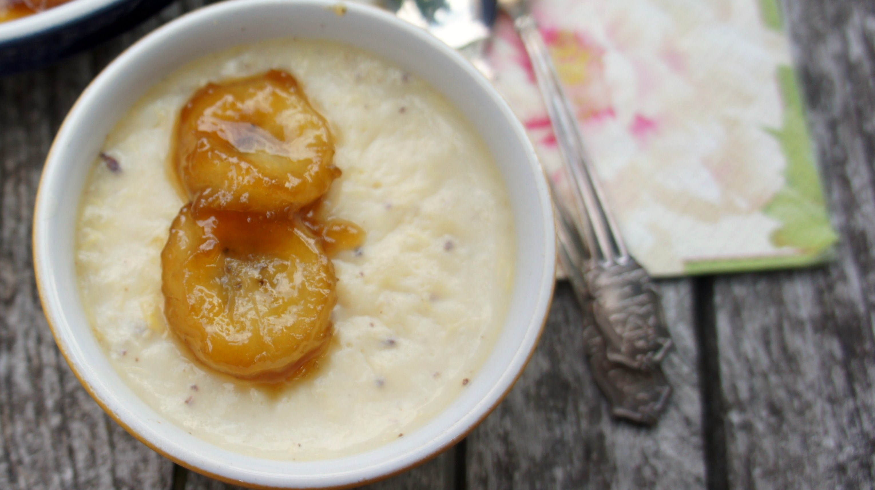 The author of the cookbook offers some lovely ideas for add-ins in your rice pudding; she suggests stirring in chopped dried fruit, nuts, or a touch of saffron. Personally, I love it with a drizzle of maple syrup stirred in. Honey is tasty, too! If you’re going to top your pudding with caramelized bananas, make them just before serving the pudding.