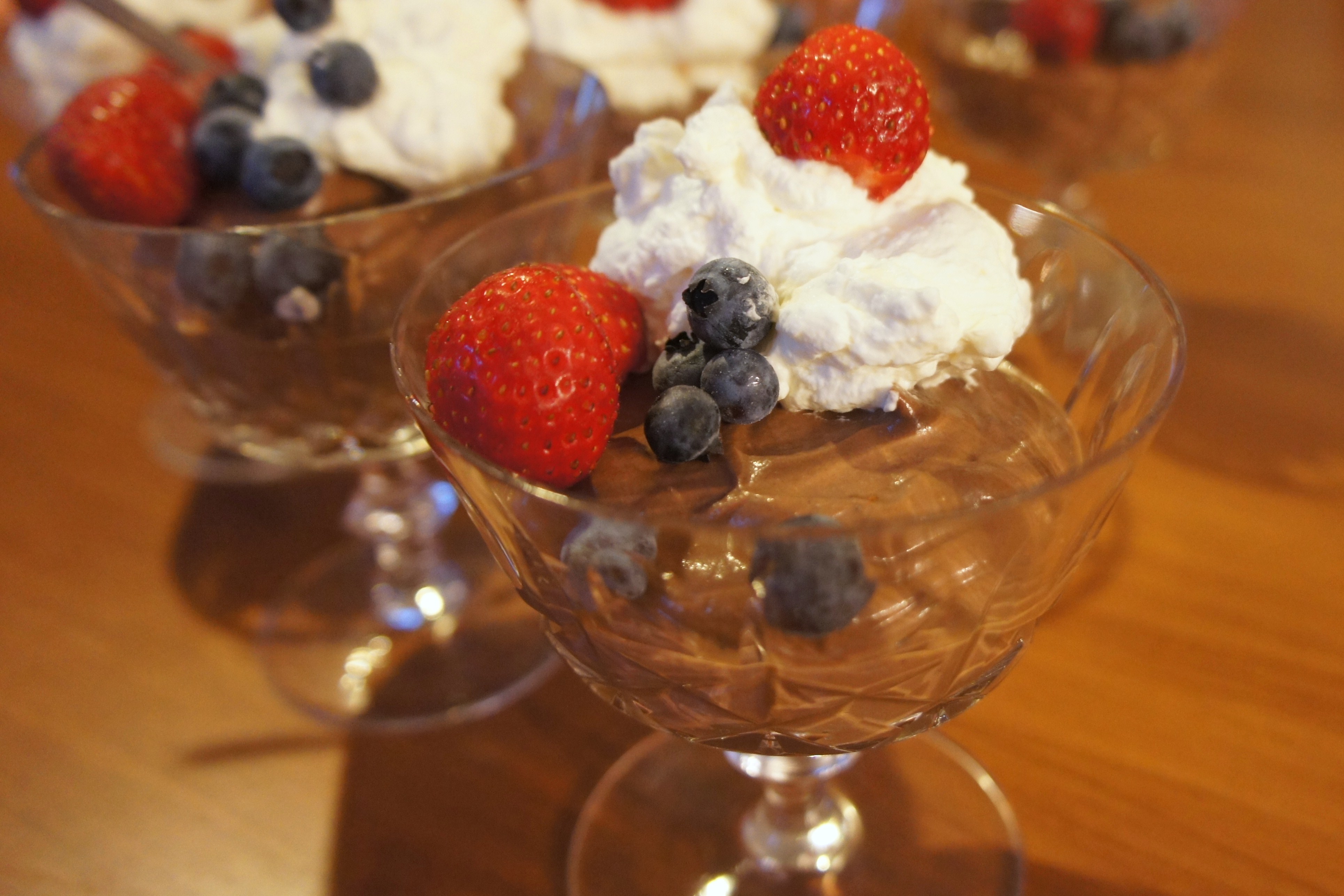 Serve the mousse with a dollop of whipped cream, and some fresh fruit, mint leaves and/or shaved chocolate.