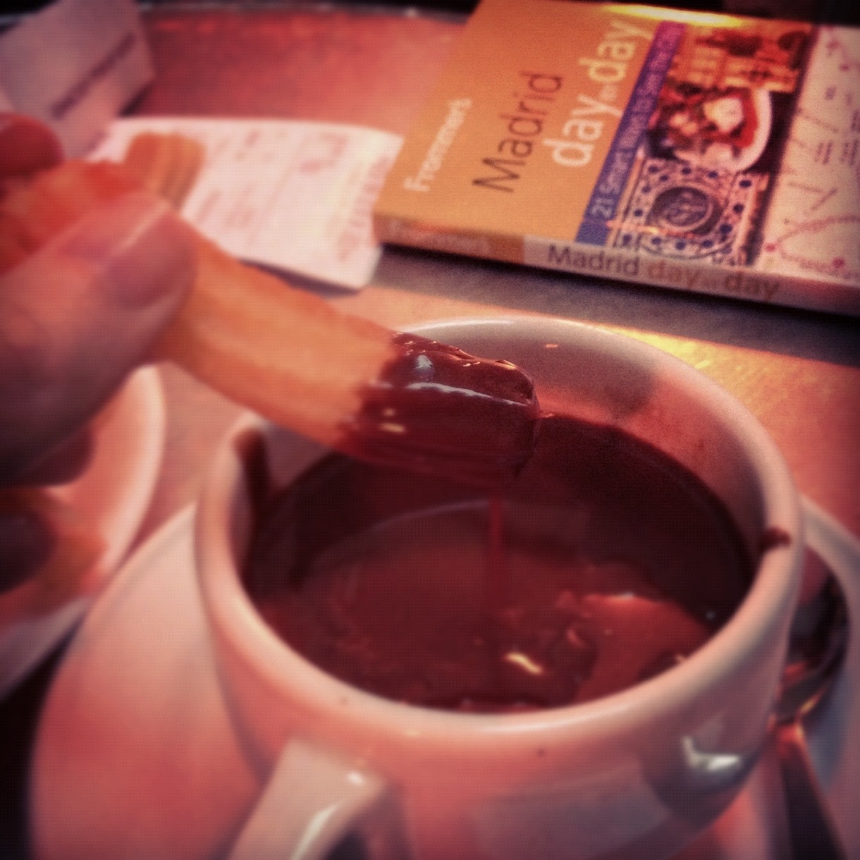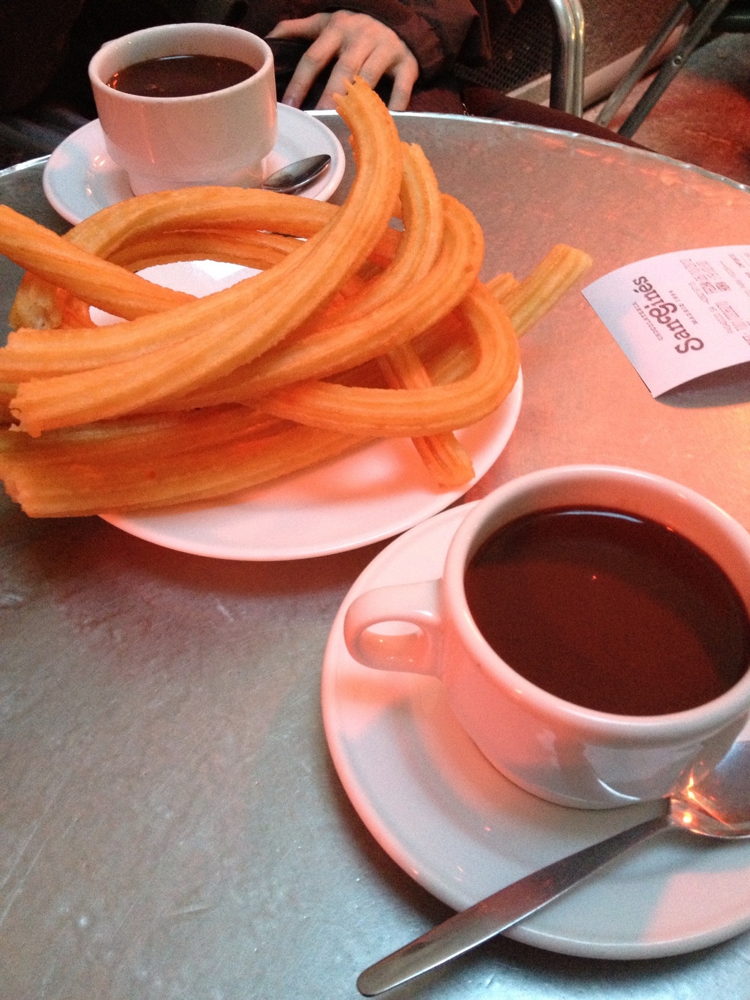 Thomas and I met up with our parents in Madrid today, and although they were pretty jet lagged from having just arrived we managed to do a good bit of sightseeing and street wandering. My mum and I both had the same thing at the top of our Madrid “to-do” list: San Ginés, Madrid’s top spot for churros con chocolate. We made it there just as the sun was setting over the beautiful Plaza Mayor and enjoyed our churros under cozy heat lamps outside. I’m so excited to be here with my family (or most of it– miss you Sam and Robbie!), and we decided that we should try a different chocolateria every day. I think I’m up for that challenge.