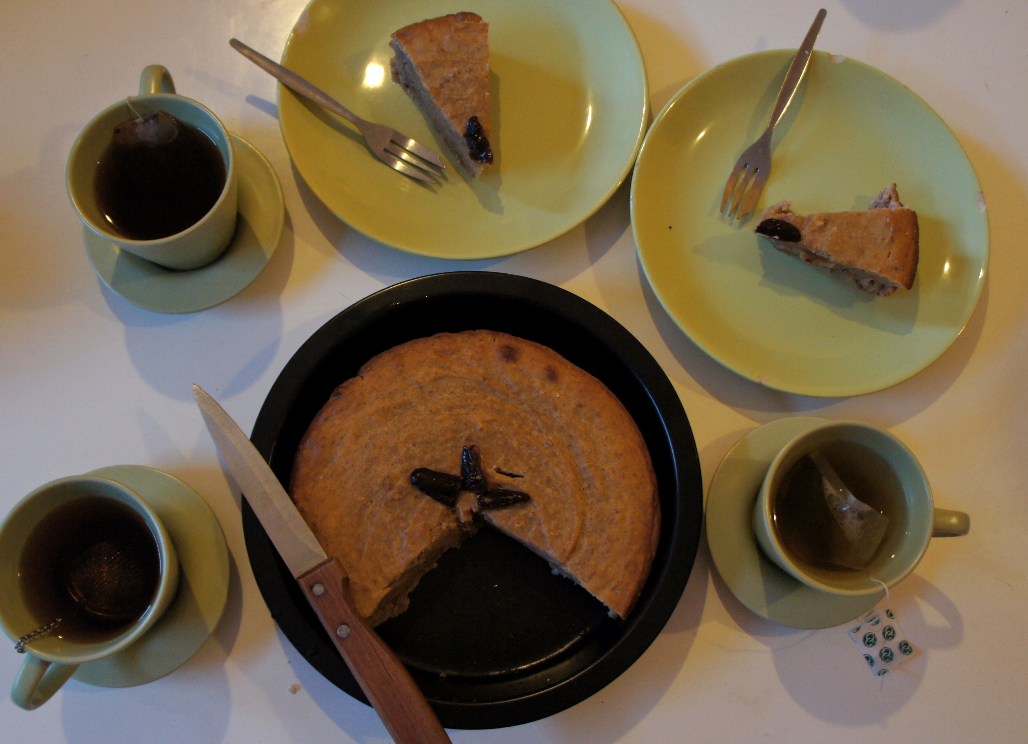 With the excitement of finally getting an oven in our apartment, I headed out to get some basic baking supplies. I was fairly successful but things like pure vanilla extract or 100% cocoa powder seemed way out of my price range and I could not for the life of me find measuring spoons, so I figured I would have to become good at guesstimating and making use of what I have! I had some dates already and modified a few recipes I found online t to come up with this really simple and really tasty spiced date lemon cake with almonds. This cake requires only a few main ingredients and doesn’t use any butter, which excited me because I’m getting frugal like that.
