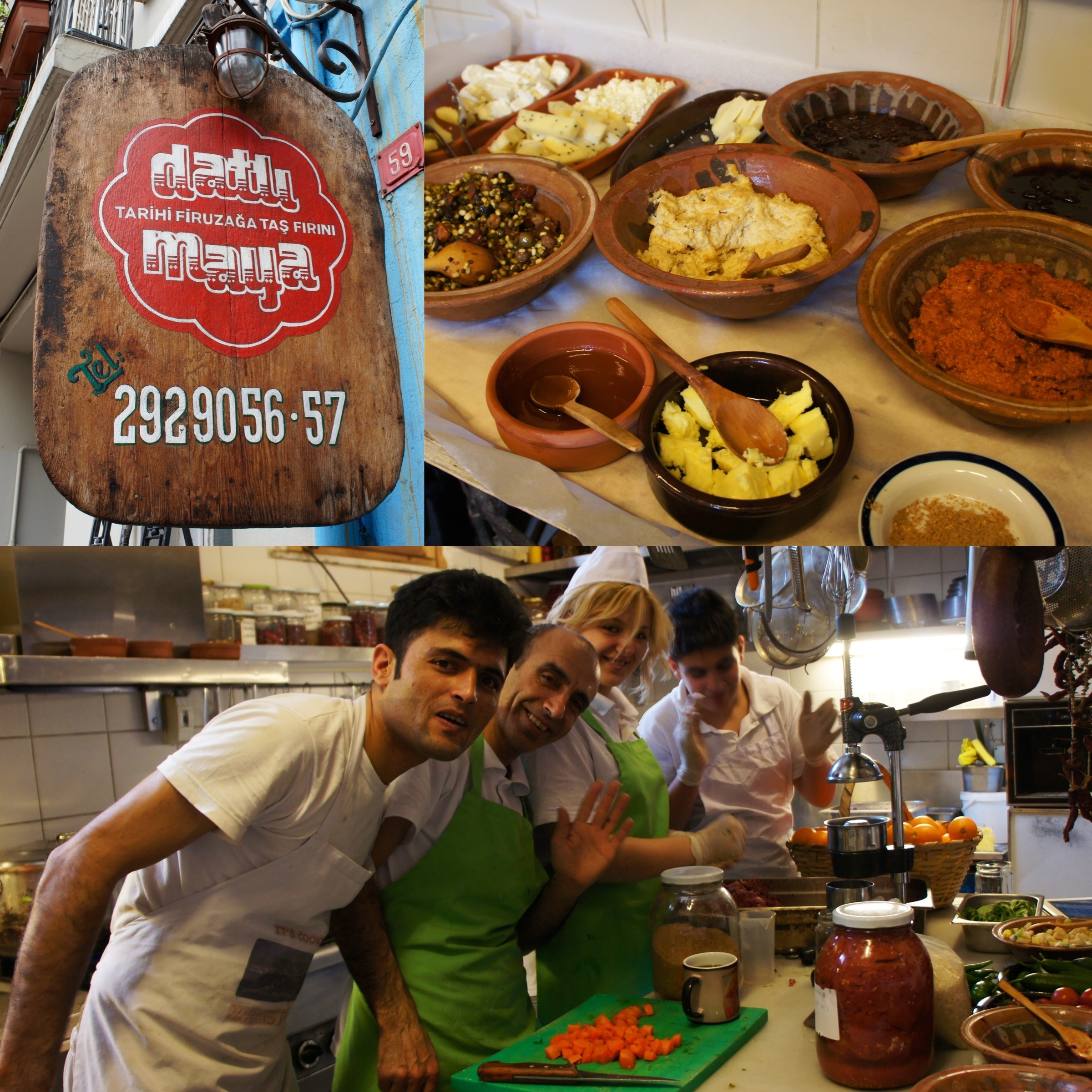 20130328-190245.jpgThe goal at Datli Maya is to revive the traditional wood oven food culture and as you walk in you can’t miss the colourful mosaic that highlights the restaurant’s oven. Fresh from said oven, we tried cheesy pides (Anatolian pizza) and lahmancunlar (very very thin Anatolian pizza) and smoky clay casseroles. Mum got hooked on the pistachio cookies. The menu includes English explanations for us new to Turkish fare, and little quips that will make you smile. For example, Kavurmali is explained as “The Turkish equivalent of Corn Beef, but much better.”, or Humous “do you really need an explanation?”.