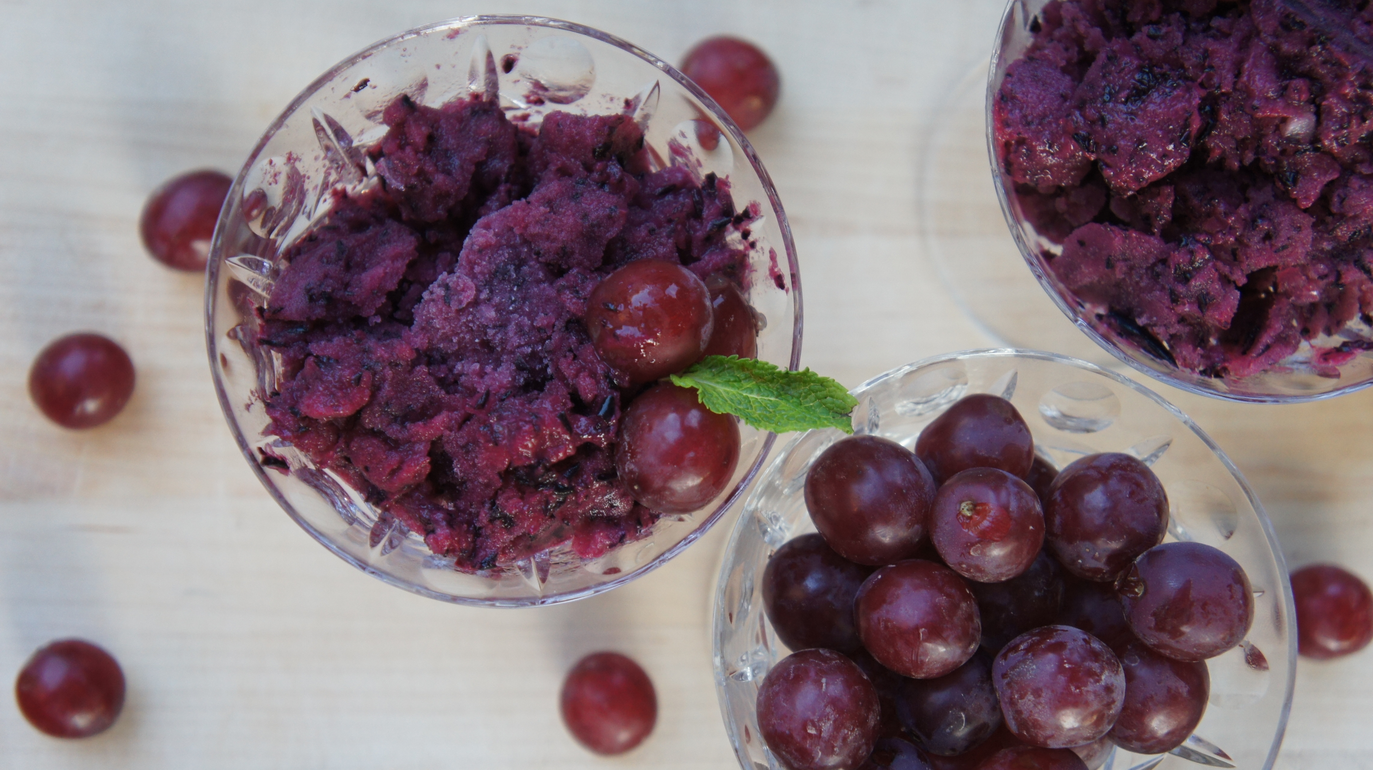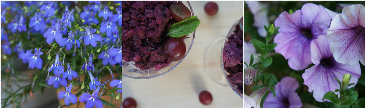 That’s my theme for summer at home– simple pleasures. (Ones that don’t involve last minute low cost flights across Europe, fresh Spanish seafood, and admiring the colour of the Adriatic sea…) Last weekend in Montreal was full of wonderful people and wonderful little things; sangria, karaoke, a picnic, Wimbledon breakfast, an italian greyhound, and napping through the hottest hours of the day. Following the weekend pace my evenings after work have been long and languid, spent catching up with friends, playing with our pup, hanging laundry on the line, and eating this icy grape dessert on the patio as the sun goes down (for the past three nights — I might have made a little bit too much.). Enjoy your weekend and all the little things!