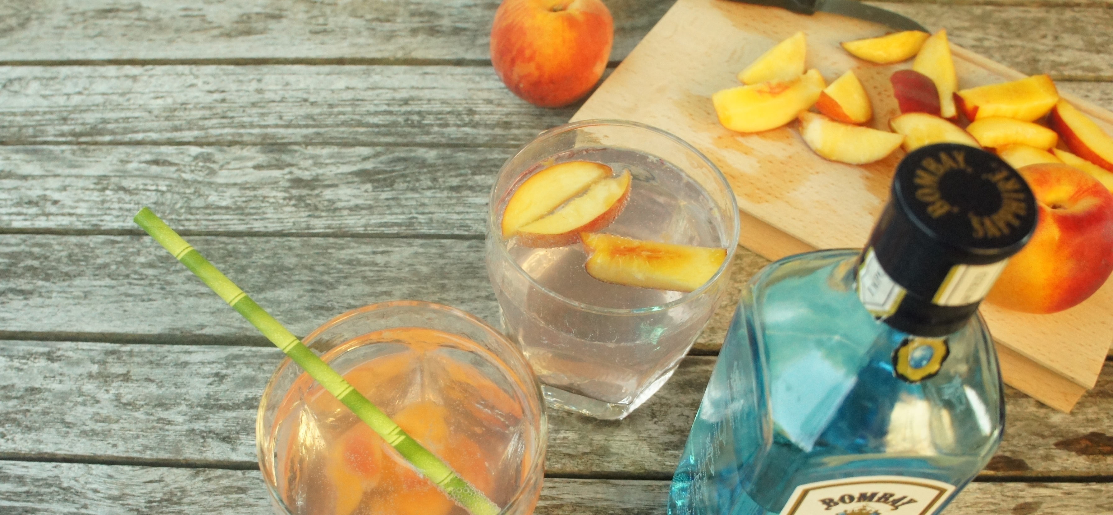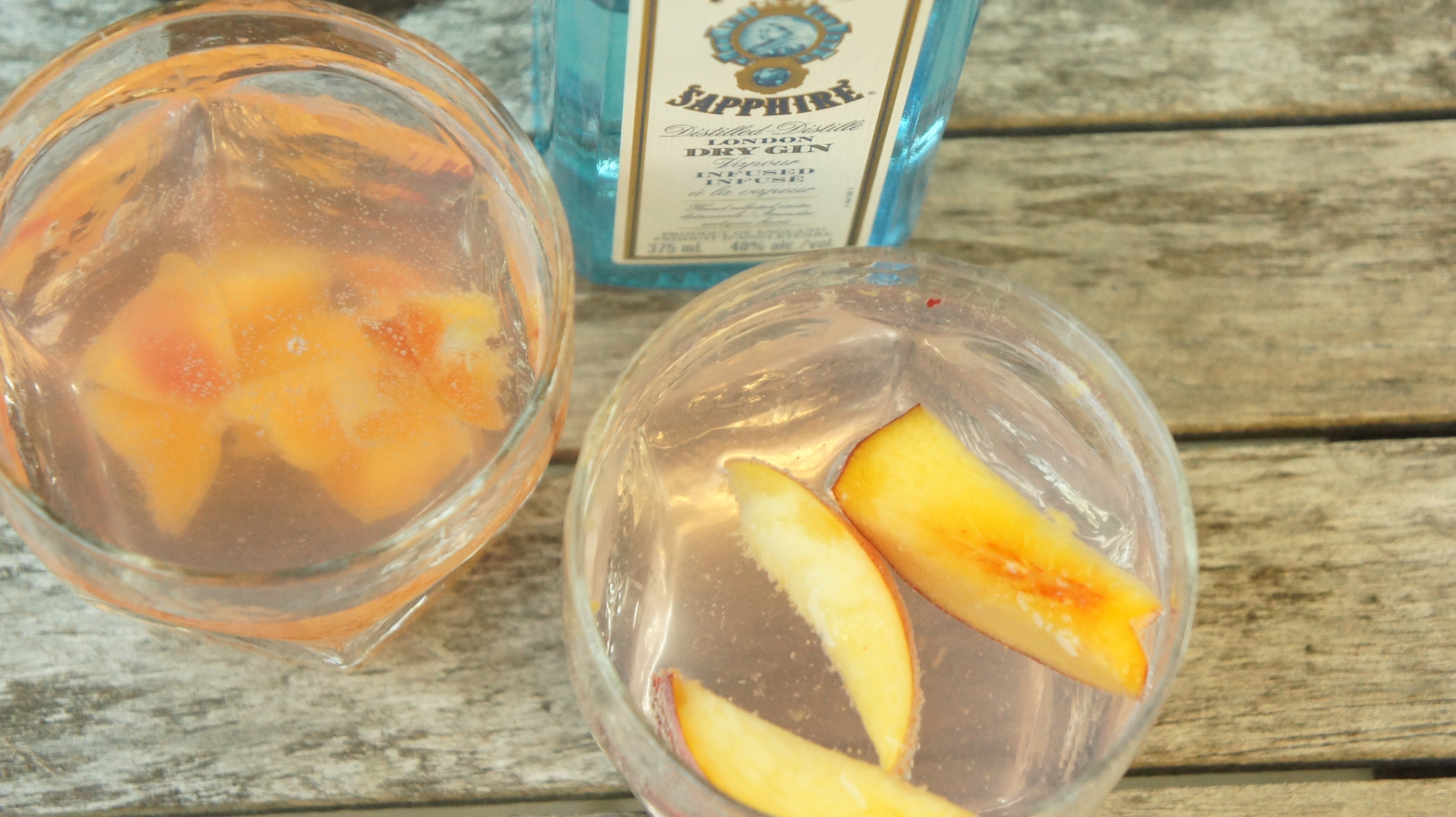 Add about 1 tbsp of peach syrup with the chopped peaches into your regular G&T — I’d say about a shot of gin, topped up with tonic water (2oz gin + 4oz tonic?), but I wouldn’t disapprove of making that a double!