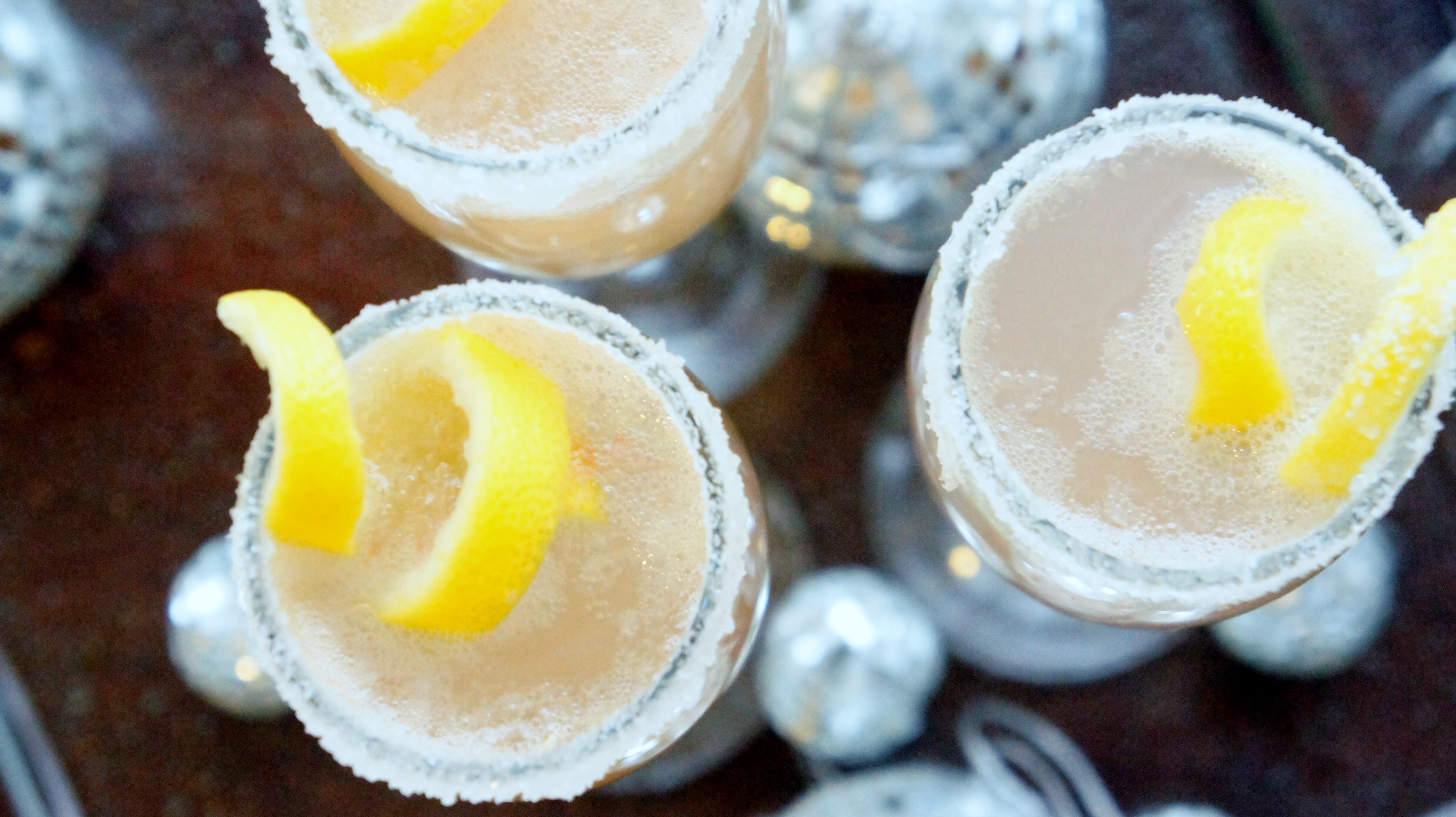 Swipe a piece of lemon (or grapefruit) around the rim of the Champagne flute and gently roll the rim of the flute in granulated sugar. Pour the juices, the gin, and the Champagne into the flute and gently stir to mix the drink. Garnish with a twisted lemon peel and enjoy!