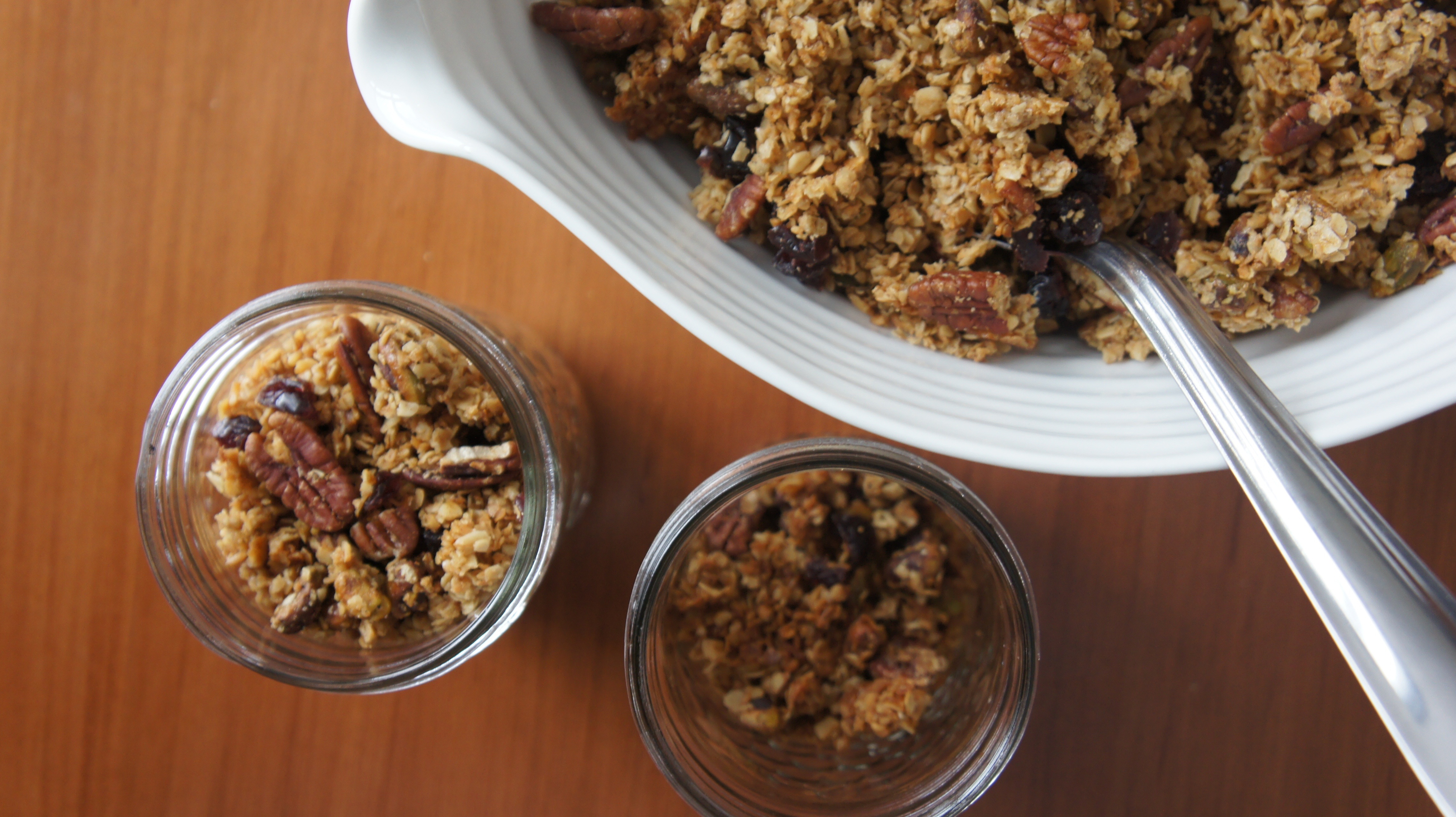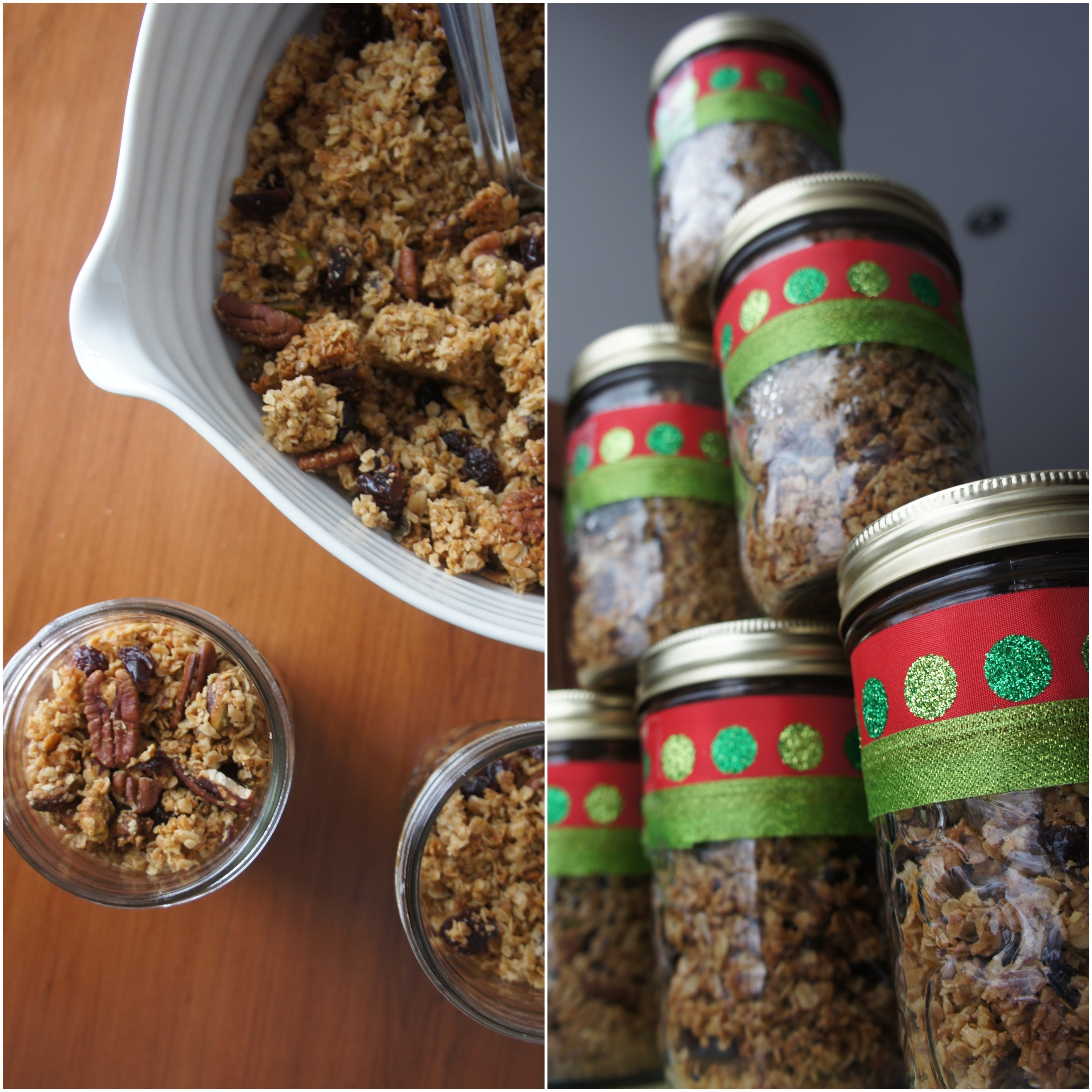 T has always been allergic to all kinds of nuts, but he was recently retested and is now able to eat pecans and pistachios…it was pretty exciting. So just before he left we made this delicious granola that includes the couple of nuts he can now enjoy.