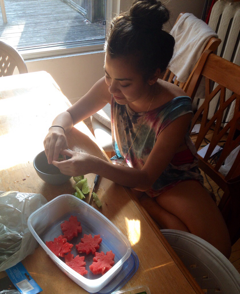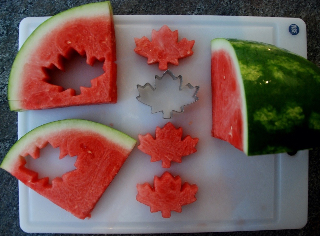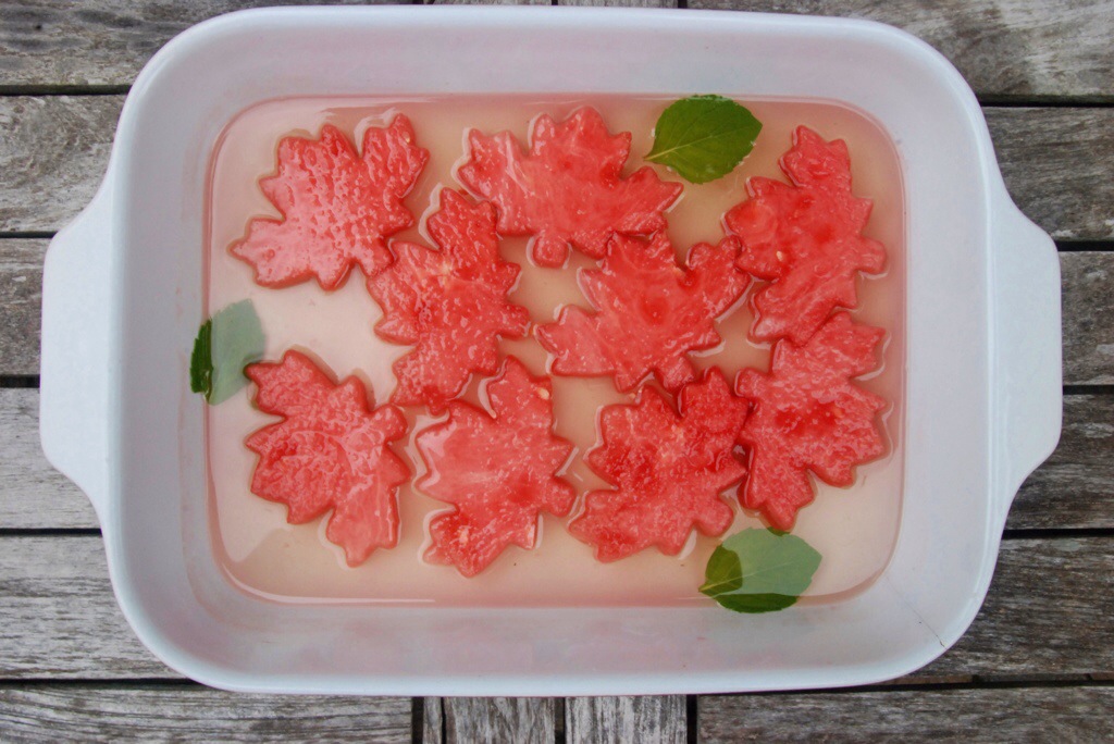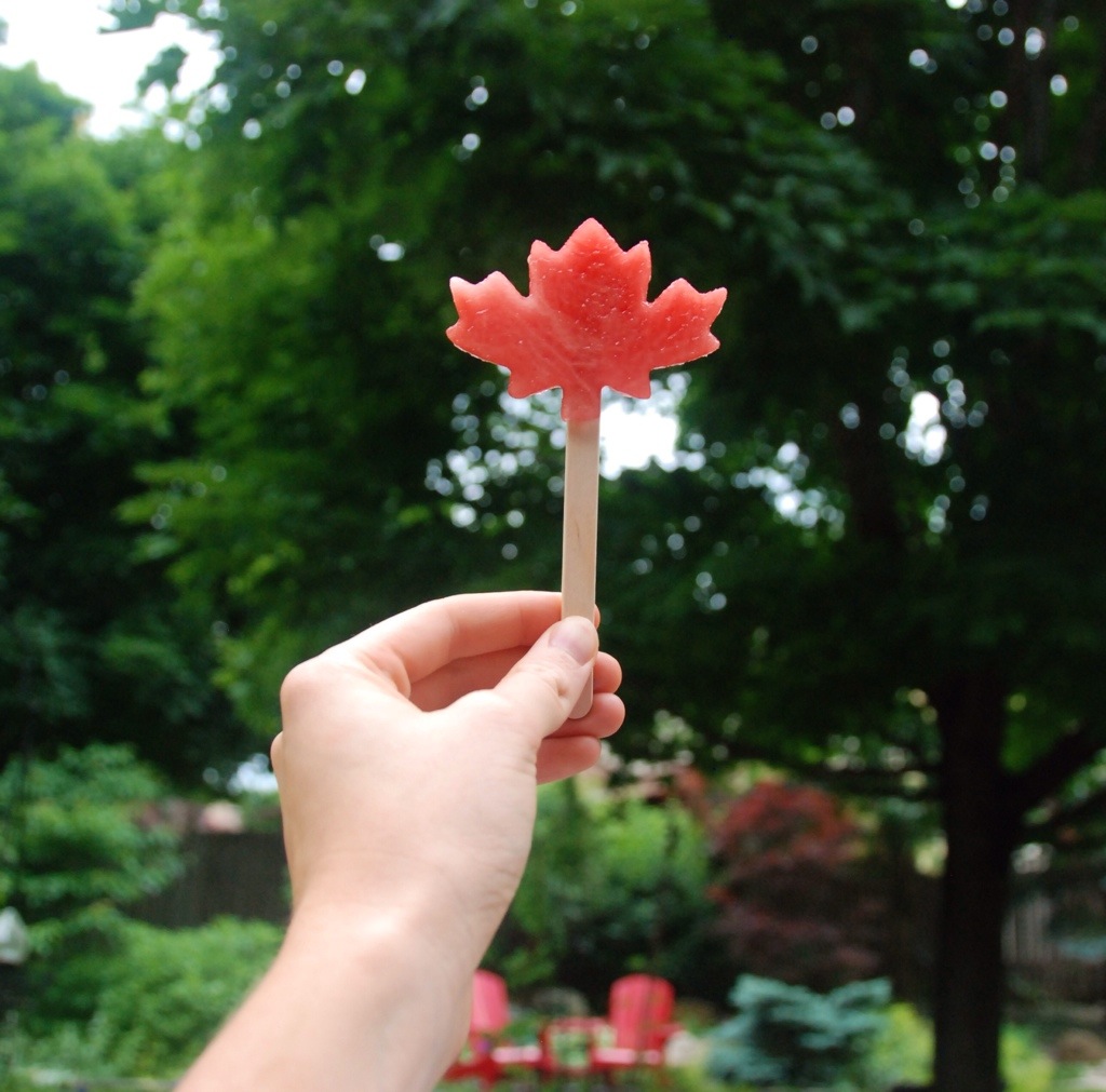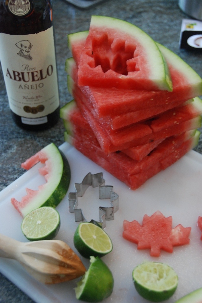 Here is my birthday gift to you: watermelon in the shape of maple leaves. Soaked in rum (mojito!! or not, for a version sans-booze). Stuck on a Popsicle stick and frozen for your patriotic enjoyment. Watermelon might not be Canadian, but that shape certainly is, and I’m pretty sure day drinking might be too…eh?