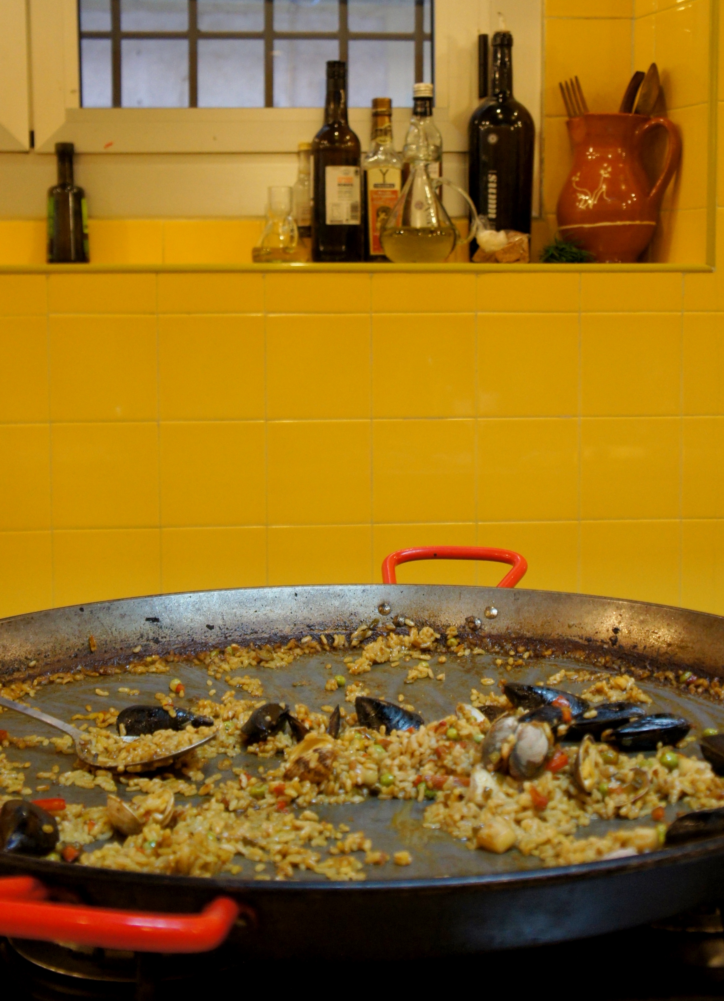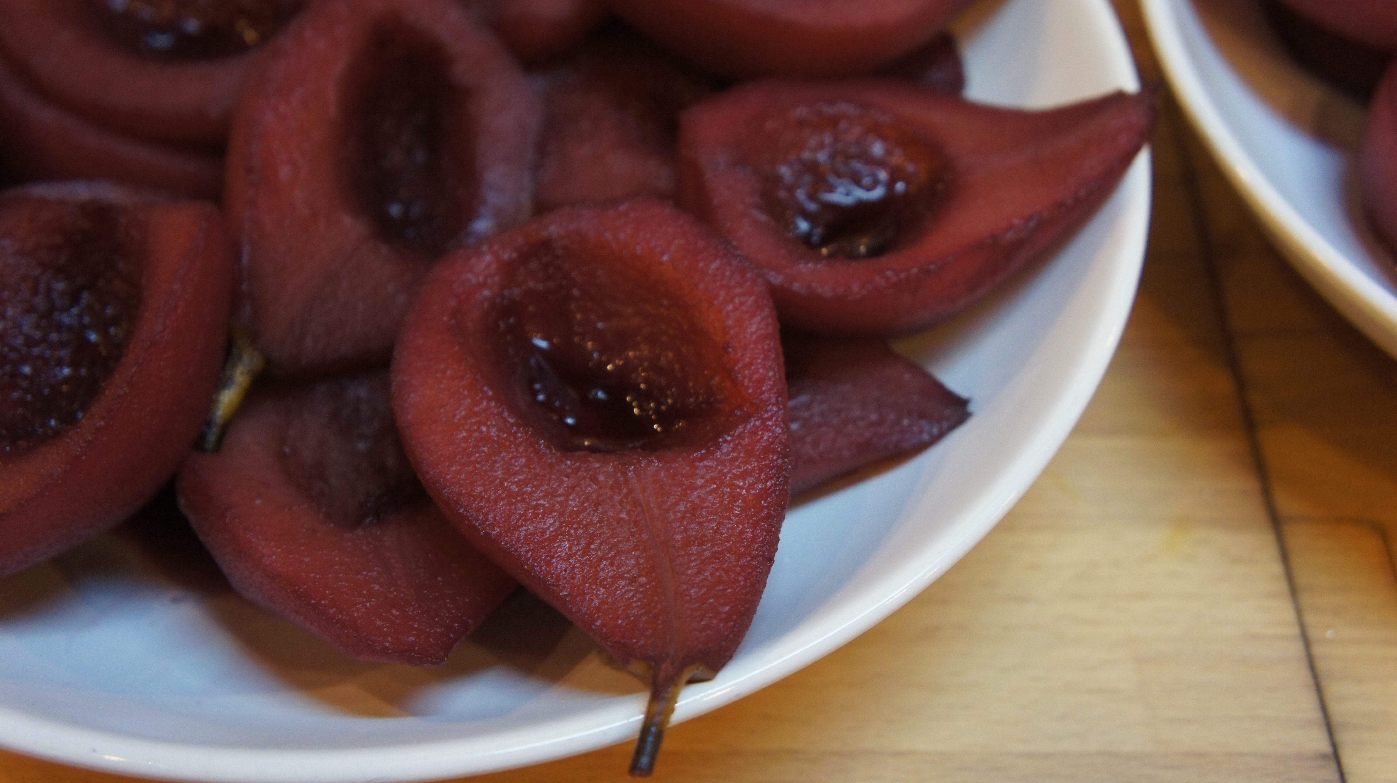 We started with a little exploring through La Boqueria. I had walked through Barcelona’s famous market a few times before, but it was great to go with our guide/teacher/food-guru for the day, María José, as we stopped to speak to each of the vendors while buying our ingredients. Jane had to jet off to Italy, so I was on my own for the cooking part of the day but my “classmates” were all super fun and friendly. I made friends with a lovely Dutch couple as we prepared mussels for the paella, and seemed to mistify a couple of nice older men from Scandinavia as to why on earth I was traveling by myself, chatted with a fellow Canuck about a certain crack smoking mayor that was making headlines at the time, and bonded with the two Aussie sisters who were charged with making sure everyone had full wine glasses. Everyone was kept busy with tasks in the kitchen and the day went by quickly. Though I had made a couple of the dishes on our menu before, it was great to follow along with a professional. We spent a couple hours getting everything ready, and then enjoyed our delicious little feast starting with tortilla de patatas con pan con tomate, salsa romesco with seasonal vegetables, the showstopping giant pan of paella de marisco, and finishing with these beatuiful burgundy pears.