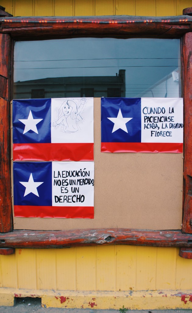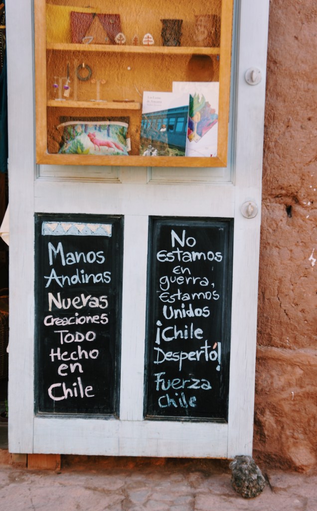 We saw small rallies (more like gatherings than protests) in Punta Arenas (where the building next to our hotel had been burned down the week before) and Puerto Varas (where they had an impressive drum line). In San Pedro de Atacama trendy shops had window signs supporting the protests and signs declaring “no estamos en guerra” (“we are not at war”), a common rebuttal to President Piñera’s initial misguided response to the riots, claiming that the country was at war and criminalizing the millions of civilians protesting.