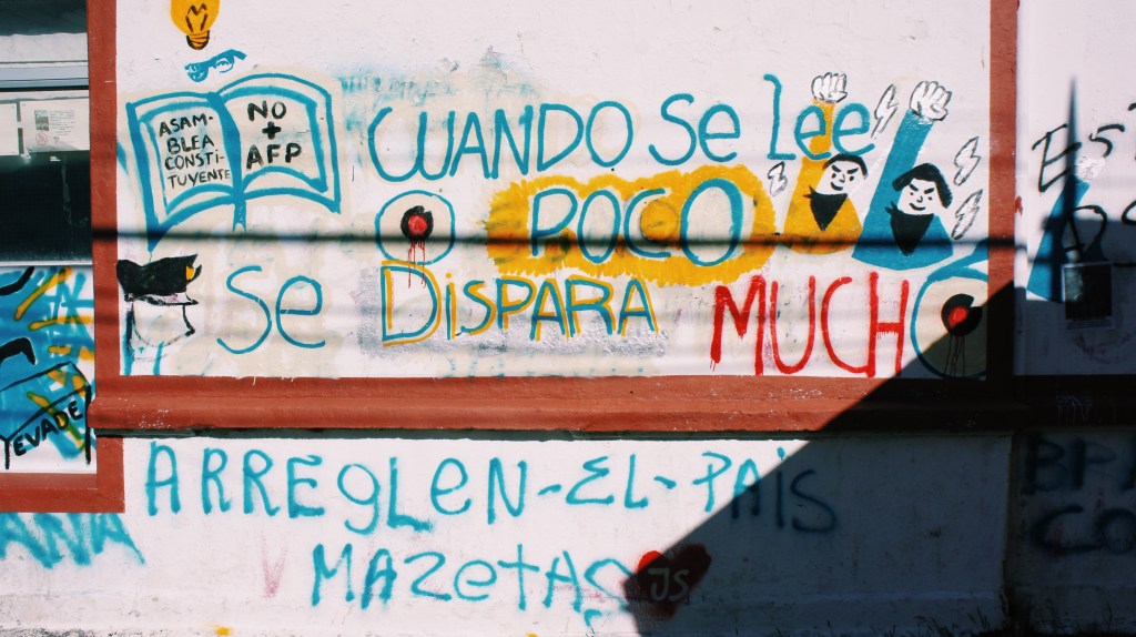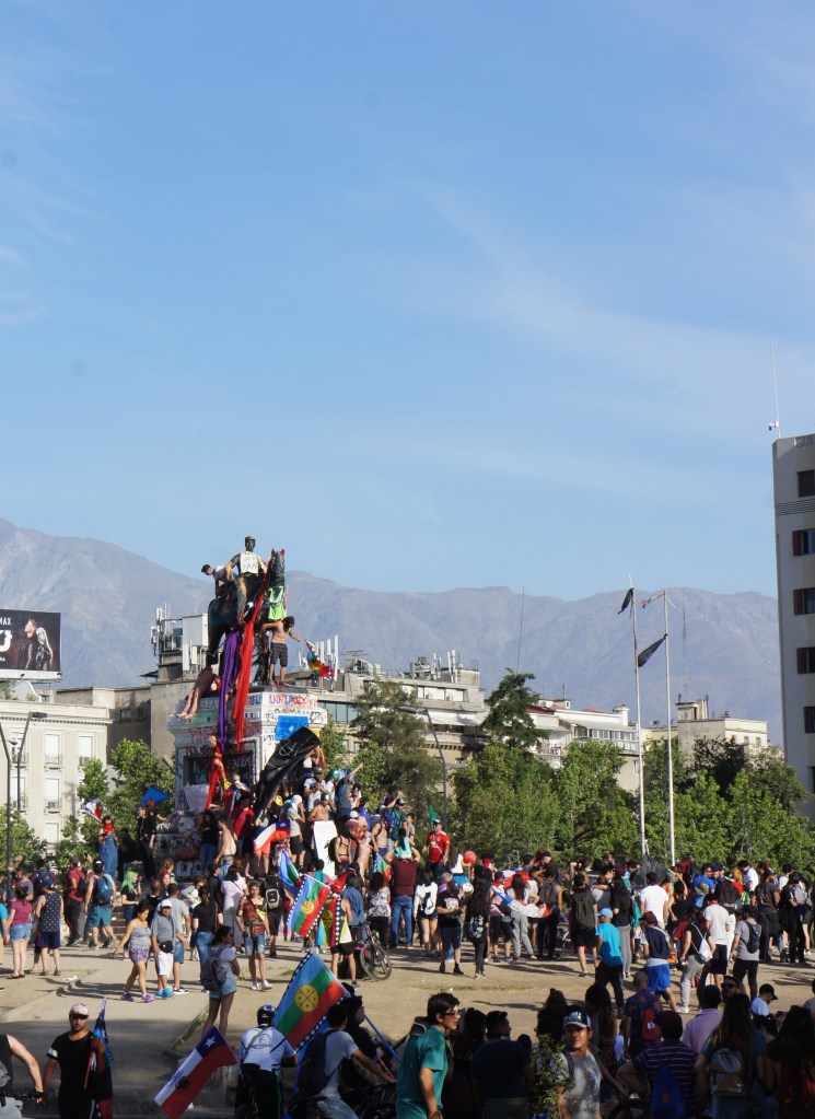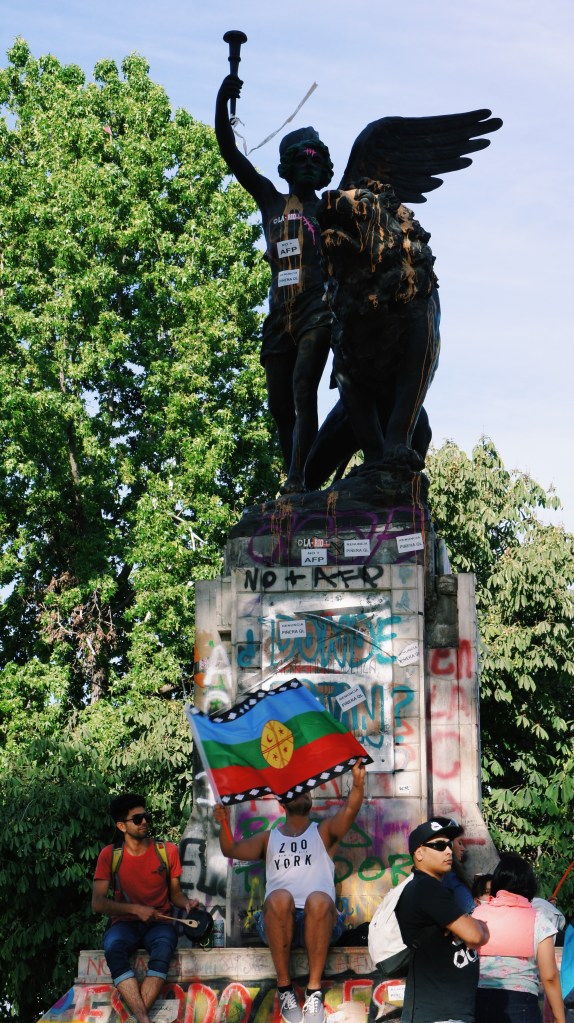 On a sunny Sunday, the crowds at Plaza Italia – the epicentre of the protests in the capital city (renamed Plaza de la Dignidad by activists)– were relatively quiet. A few hundred people chanted, cheered, banged pots with wooden spoons and waved the Chilean or Mapuche flag. Santiago, like every other Chilean city we traveled through, has been covered in graffiti.